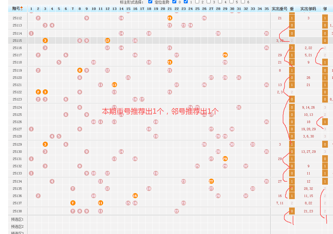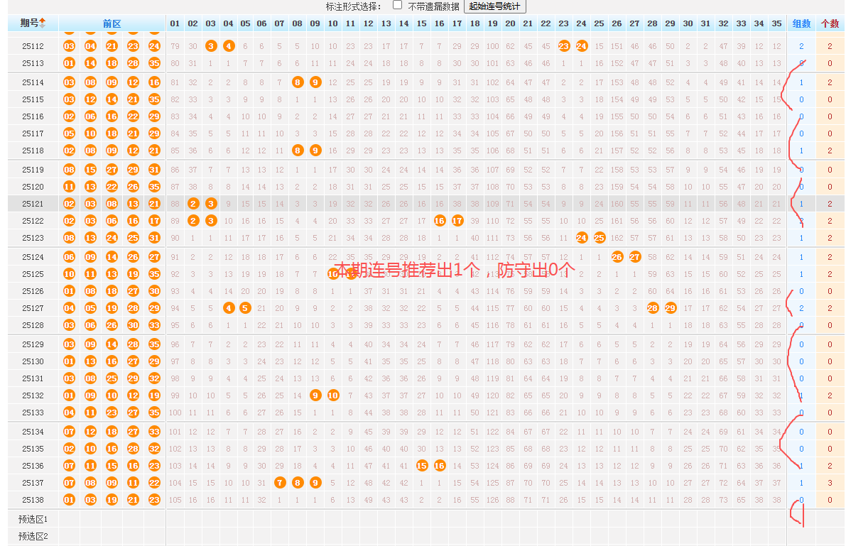 1、前区重号走势:上期前区开出0个重号,近75期出号个数为:-1-1-0-0-1-1-2-0-0-0-0-1-1-0-1-0-1-0-0-1-1-1-2-0-0-1-0-3-1-0-2-0-0-1-0-0-1-2-1-1-0-1-1-1-0-1-0-0-1-0-0-0-0-2-0-1-0-2-0-0-0-0-0-0-1-0-1-0-0-0-1-0-1-2-0-,根据出号规律出120后紧随出1-1-1-0-0-2-0-0-0-1-0-0-1-0-0-1-0-1-1-0-0-1-0-1-1-2-2-0-1-1-1-1-0-2-0-2-0-1-0-1-0-0-0-,本期推荐出1个,本期重点推荐出1个。