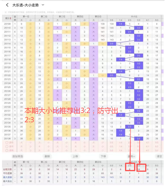 6、大小比:上期开出大小比为3:2,近85期开出4:1出现19次,3:2出现39次,2:3出现39次,1:4出现25次,5:0出现3次,本期推荐出3:2,防守出2:3。