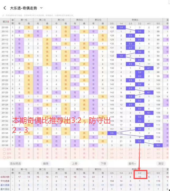 4、奇偶比:上期开出5个奇数,出0个偶数,奇偶比5:0,整体看奇数强势,本期关注偶数回补,本期推荐出3:2,防守出2:3 。