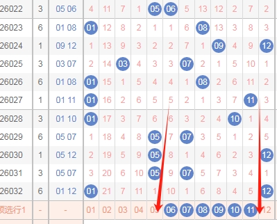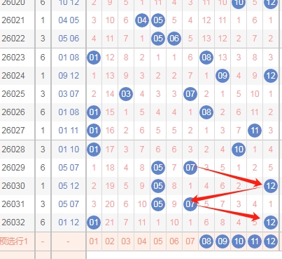 上图是体彩大乐透后区开奖号码走势分布图,我在上面走势图中标注出来的红色箭头表示右边这个数字最近几期开出的跨度,可以发现右边这个数字最近3期开出的跨度都是5,那么本期可以关注小跨度的数字,那么范围就是数字08 09 10 11 12。
