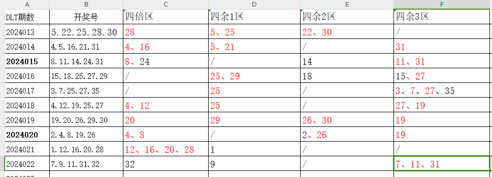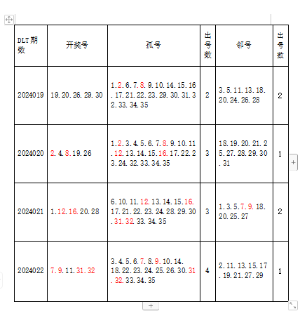上面的统计表格是近4期的开奖号码、孤号、邻号统计分析表,我们两期为一组进行比对。2024019--20期:相同的孤号2、8,在 2024020期开奖号码开出;2024020--21期:相同的孤号12、16,在2024021期开奖号码开出;2024021--22期:相同的孤号31、32,在2024022期开奖号码开出。同时还有两期孤号、邻号交叉重复的情况,2024022期的孤号7、9和2024021期的邻号7、9交叉重复,在2024022期开奖号码开出。通过统计表格可以直观的看出这些规律,这就是数据分析的乐趣。