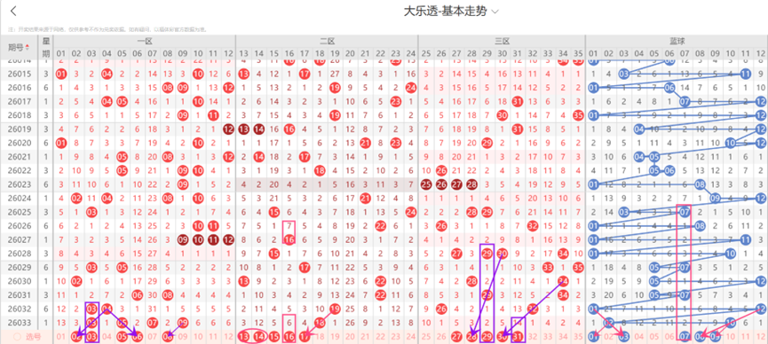上期三区出现了断区的情形,本期三区连续断区的可能性小,本期三区出号数量可以考虑1-2个;本期三区需要关注的号码:28与29-30形成了斜连走势;27-28可能会同时落号;29为当前后区出号热点号码;30与32-34形成了斜连走势;31遗漏值高,值得防守;因此本期三区选号范围为27-28-29-30-31等号码。