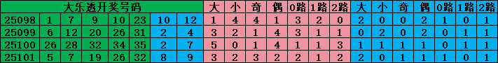 超级大乐透前区是从01-35号每期开出5个号码,后区是从01-12号每期开出2个号码,前区01-17号是小号,18-35号是大号,后区01-06号是小号,07-12号是大号,前区后区尾数13579都是奇数号,02468都是偶数号。012路比前后区也用尾数定0369是0路,147是1路,258是2路
