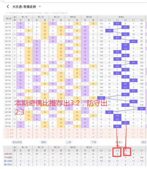 4、奇偶比:上期开出2个奇数,出3个偶数,奇偶比为2:3,整体看偶数强势,本期关注偶数回补,本期推荐出3:2,防守出2:3 。