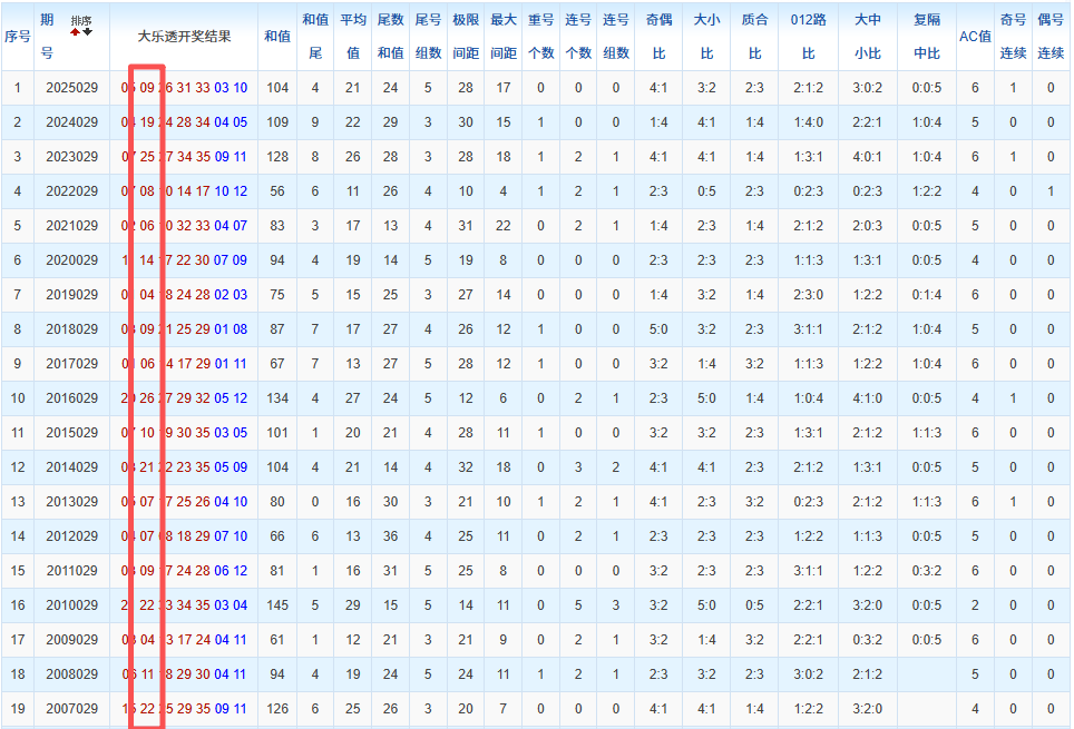 通过观察,我发现往年同期的开奖数据与本期号码之间存在显著关联。具体来说,在前区号码中,从第一位至第五位,通常会有约三个位置上的数字与往年同期相同位置的号码一致;而后区号码中,也有多期开奖结果直接包含了往年同期的数字。因此,我们可以借助往年同期各位置上的号码,作为分析本期开奖情况的重要依据。在此基础上,还可结合往年同期的其他相关条件,进行综合性的号码组合推荐。
