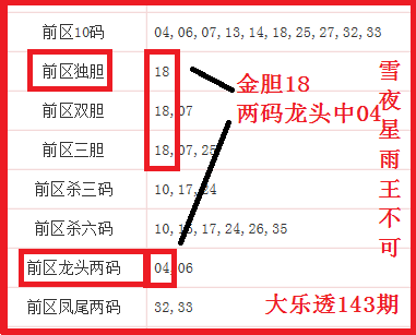 大乐透144期,上期金胆18,两码龙头中04,,本期前后区关注什么?谈关键