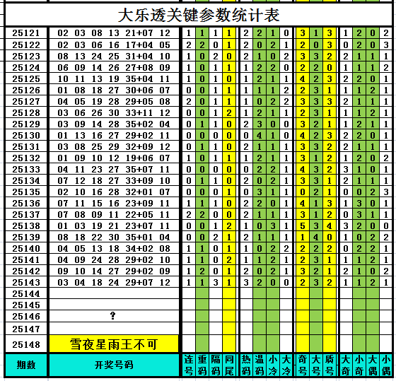 以下是作者手工统计的大乐透关键参数统计表,对喜欢参数分析、过滤缩水、选号胆杀的技术性大乐透爱好者有所帮助,其它读者可略过不看。