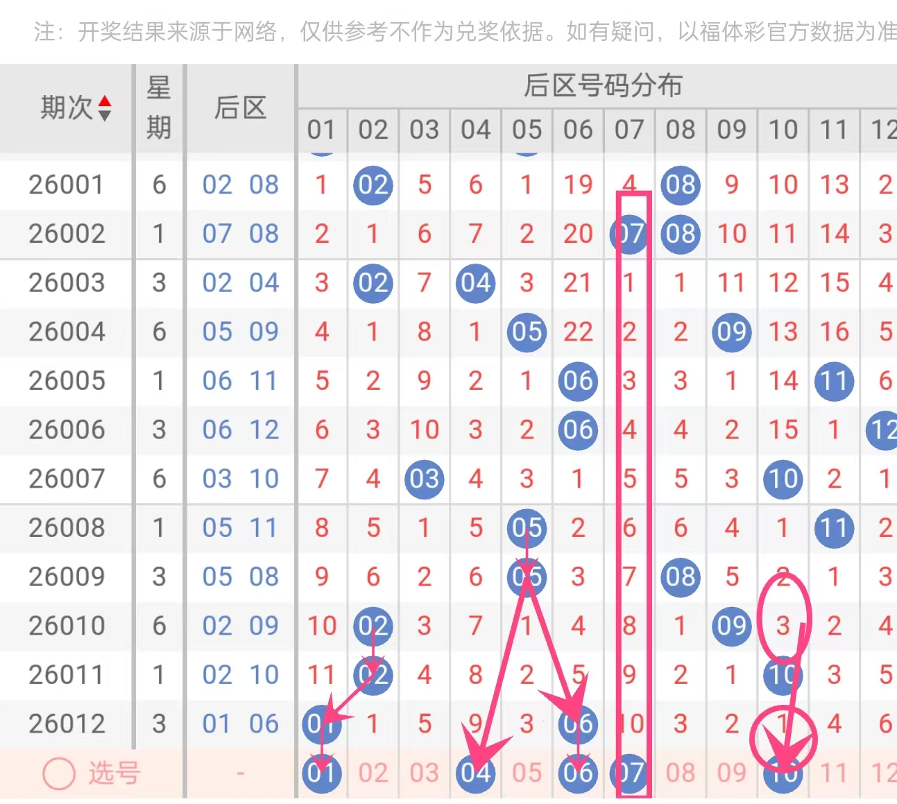 后区选择01、04、06、07、10,主要基于“热冷搭配”与“跨度对称”。01在2026012期开出后,与06形成“小跨组合”,此类小跨组合在近5期出现3次(如2026009期05、08,2026012期01、06),值得延续;04虽在近期后区未出现,但前区04冷极可能带动后区04作为平衡号出现;06是近期活跃号(2026012期),且与01、10形成“1-6-10”的等距跨度,符合后区常见分布模式;07在2026008期后遗漏,但与06、10构成中段密集区(06、07、10),防回补;10在2026011期出现后,与01形成“首尾呼应”,且10在历史数据中常伴随热号如06出现。整体后区侧重小号(01、04、06)与中号(07、10)的均衡,避免大冷号(如12)与过热号(如02)。
