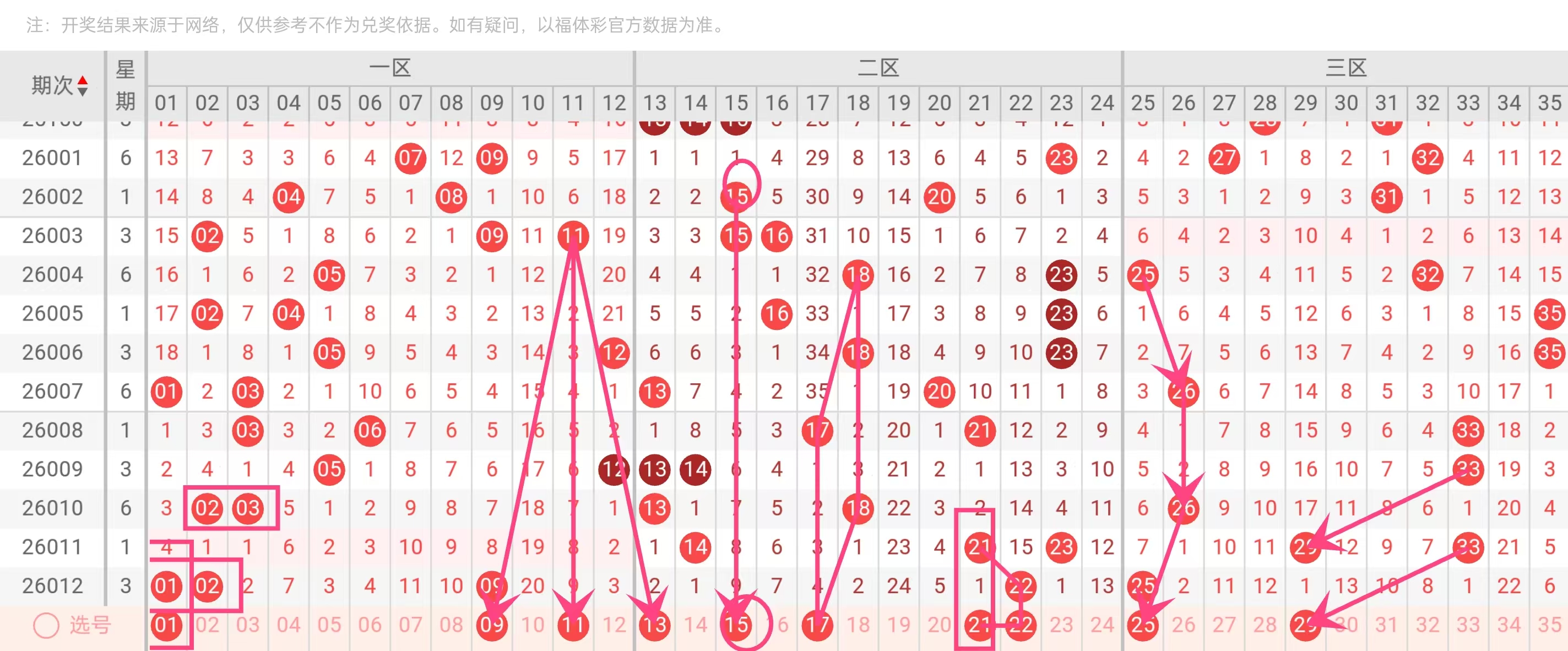 区间分布:前区号码在01-12区间出现较少(近5期仅01、02、03、05、06、09、12),13-25区间密集,26-35区间活跃(尤其33)。