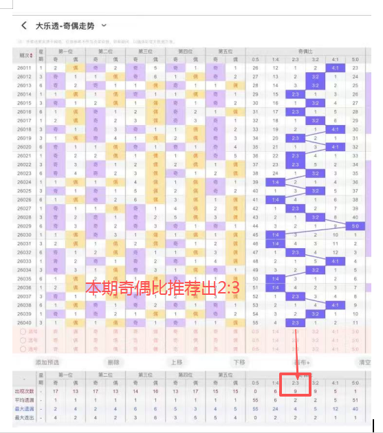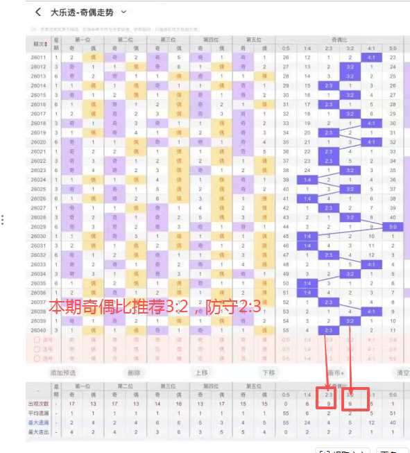 4、奇偶比:上期开出2个奇数,出3个偶数,奇偶比为2:3,整体看偶数强势,本期关注偶数出号,本期推荐出2:3。