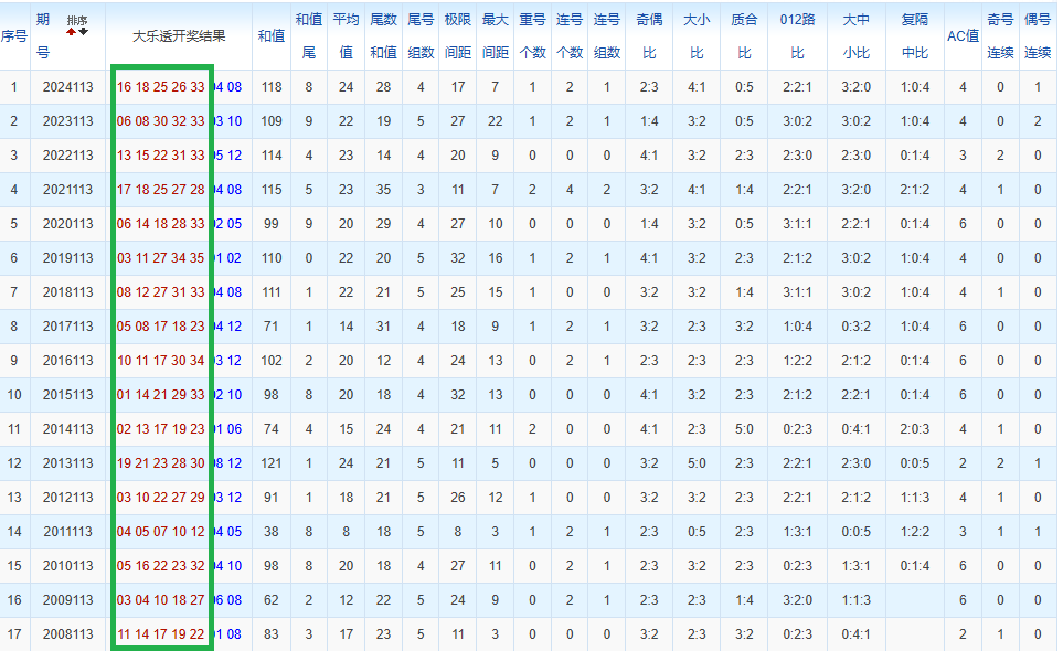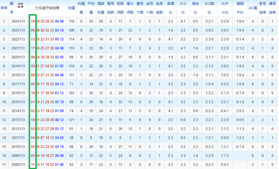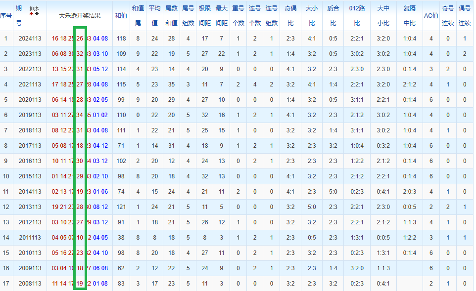 通过观察,我发现往年同期的开奖数据与本期号码之间存在显著关联。具体来说,在前区号码中,从第一位至第五位,通常会有约三个位置上的数字与往年同期相同位置的号码一致;而后区号码中,也有多期开奖结果直接包含了往年同期的数字。因此,我们可以借助往年同期各位置上的号码,作为分析本期开奖情况的重要依据。在此基础上,还可结合往年同期的其他相关条件,进行综合性的号码组合推荐。