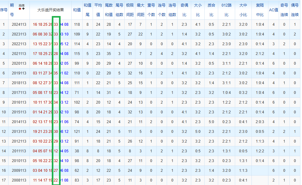 首先我们来观察这17期每个号出球的次数,这里找出出现次数靠前的号作为我们的重点关注号码:33 27 18 17 等。