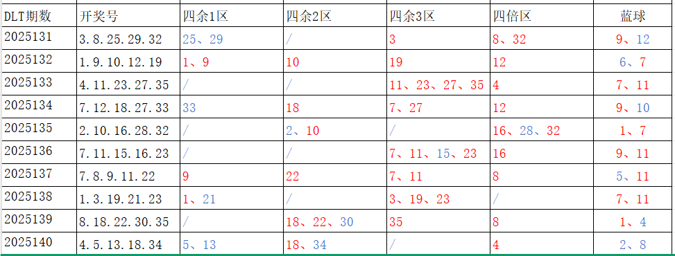 分享第一个数据分析:四分区统计数据。相对于传统的三分区,个人习惯使用四分区,就是把35个红球号码除以4,所得的余数分区如下:
