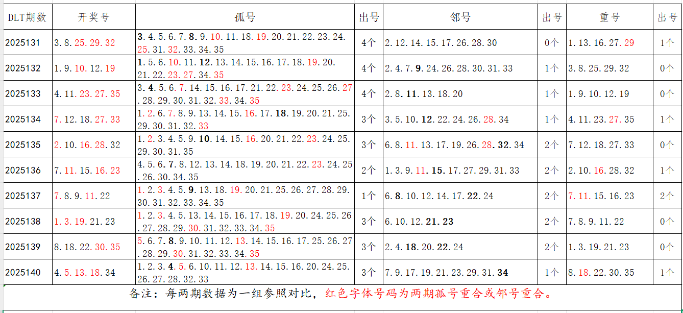 如图,以近两期数据为一组,进行对比分析,相同的孤号、邻号可能在下期开出。本期参考孤号:1.2.7.8.9.10.11.15.16.20.21.22.23.24.25.26.27.28.29.30.31.32;邻号:3.6.12.14.17.19.33.35。重点关注:孤邻号重合号码:***(会员专区可见)。个人分析,仅供参考。