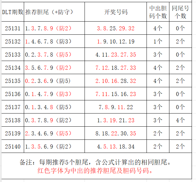 如图,每期推荐胆尾中出1-4个。上期推荐胆尾中出2尾2码!推荐胆尾是按照公式计算的顺序,不定位红球号码的顺序。本期推荐胆尾:9尾/4尾/3尾/0尾/1尾,加推防守胆尾+胆码号码:***(会员专区可见)。个人分析,仅供参考。
