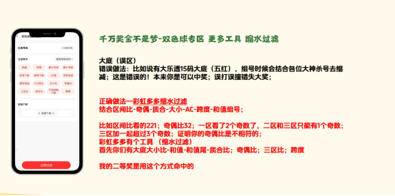 错误做法:比如说有大乐透15码大底(五红),组号时候会结合各位大神杀号去缩减;这是错误的!本来你是可以中奖;误打误撞错失大奖;