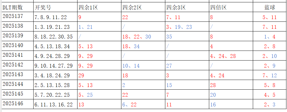 如图,红色字体是重复开出的号码,即为热号。蓝色字体是开出一次的号码,即为冷号。以近10期为一个分析周期:4余2区、4余3区,走势较冷;4余1区、4倍数区,走势较热。依据久热必冷,久冷必热的规律,本期重点关注:4余2区、4余3区,区间号码可能开出1-2个;4余1区、4倍数区,区间号码可能开出2-3个。区间冷热号码精选:***(会员专区可见)。个人分析,仅供参考。