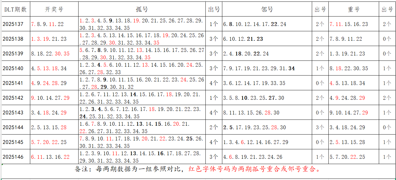 如图,以近两期数据为一组,进行对比分析,相同的孤号、邻号可能在下期开出。本期参考孤号:1.2.3.4.8.9.18.19.20.24.25.26.27.28.29.30.31.32.33.34.35;邻号:5.7.10.12.14.15.17.21.23。重点关注:孤邻号重合号码:***(会员专区可见)。个人分析,仅供参考。