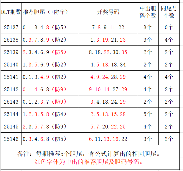 如图,每期推荐胆尾中出1-4个。上期推荐胆尾中出2尾3码!推荐胆尾是按照公式计算的顺序,不定位红球号码的顺序。本期推荐胆尾:9尾/2尾/1尾/3尾/8尾,加推防守胆尾+胆码号码:***(会员专区可见)。个人分析,仅供参考。