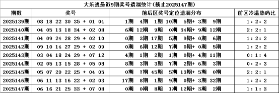 体彩大乐透第2025147期奖号为:06 16 21 25 33 + 07 08,各位号码遗漏期数分别为:0期、0期、8期、1期、12期+3期、2期,前区号码遗漏总期数为21期,012路比为3:2:0,奇偶比为3:2,包含2个重复号码:06、16。后区号码遗漏总期数为5期,和值为15,跨