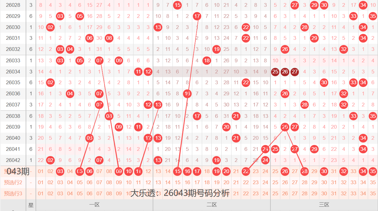 通过上期号码的简单分析,我们看下26043期红色号码球的总体走势,如下图: