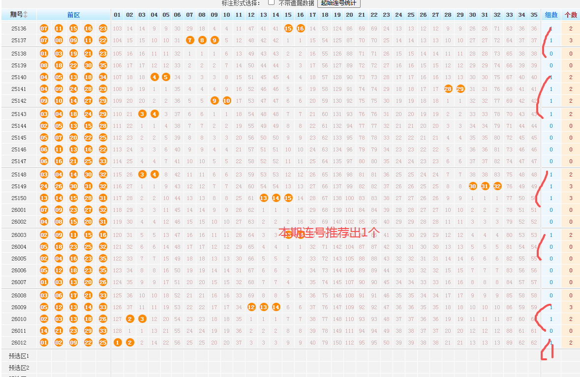 上期奖号开出01 06,出1个大号,最近97期开出大奖号134枚,小奖号开出74枚。大小比为1:1,本期防01 06出1-0个,本期推荐后区出02、04、06、 08、10、12
