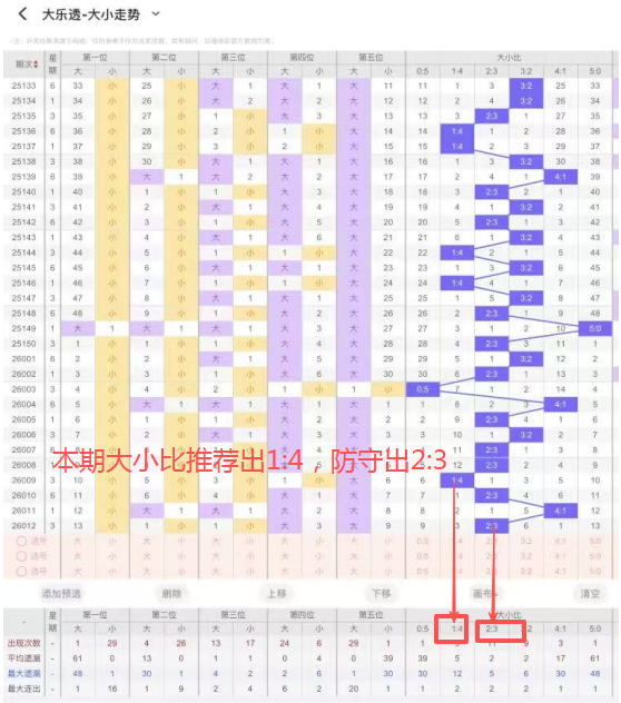 5、大小比:上期开出大小比为2:3,近107期开出4:1出现23次,3:2出现46次,2:3出现47次,1:4出现29次,5:0出现4次,本期推荐出2:3,防守出1:4。