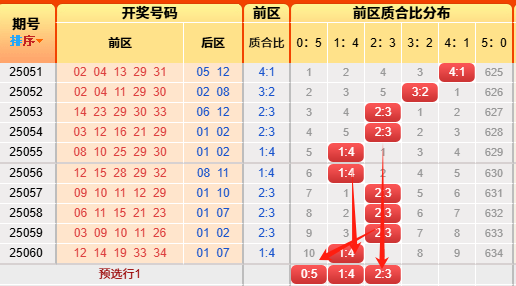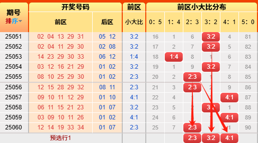 上期前区小大比2:3,命中啦,觉得有用的就点击上个车查看数据。言归正传我们继续用历史数据说话,前区小大比分成6种0:5、1:4、2:3、3:2、4:1、5:0(如图),我统计了一下历史出现次数,0:5出现105次、1:4出现505次、2:3出现948次、3:2出现780次、4:1出现339次,5:0出现51次,再看近10期小大比出现次数比为0:1:3:4:2:0,通过历史数据对比观察以及根据遗漏对称理论原则,故本期我们选择4:1、2:3、3:2。(具体精准方向请查看小车小大比精选)