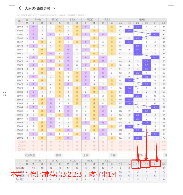 4、奇偶比:上期开出2个奇数为17 25 ,出偶数2个 04 10 32,一般开出奇数期数较长,奇偶比为2:3,近72期奇偶比为188:196,整体看偶数走势上升。本期重点看奇数强势。本期推荐出3:2,2:3,防守出4:1,本期重点关注3:2。