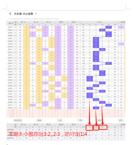 6、大小比:上期开出大小比为2:3,近50期开出4:1出现17次,3:2出现22次,2:3出现32次,1:4出现20次,5:0出现2次,本期推荐出3:2,2:3,防守出,1:4,本期重点推荐出2:3。