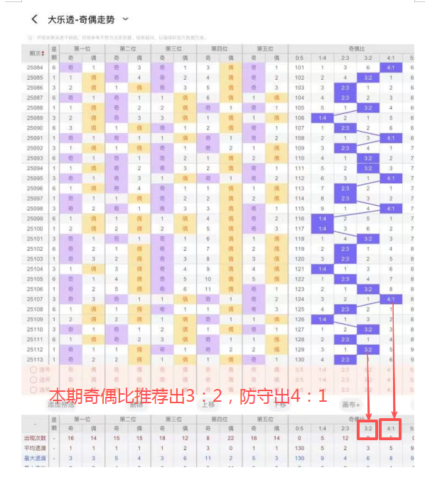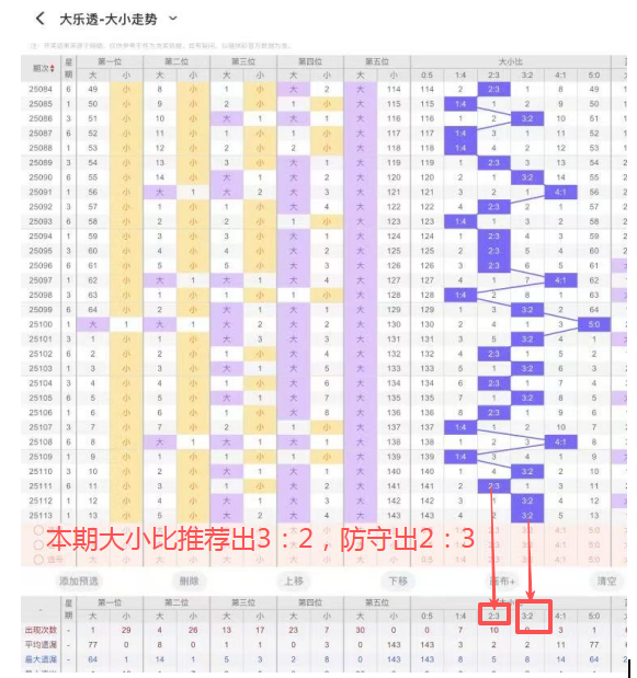 6、大小比:上期开出大小比为3:2,近71期开出4:1出现19次,3:2出现28次,2:3出现40次,1:4出现24次,5:0出现3次,本期推荐出3:2,防守出2:3,本期重点推荐出3:2。