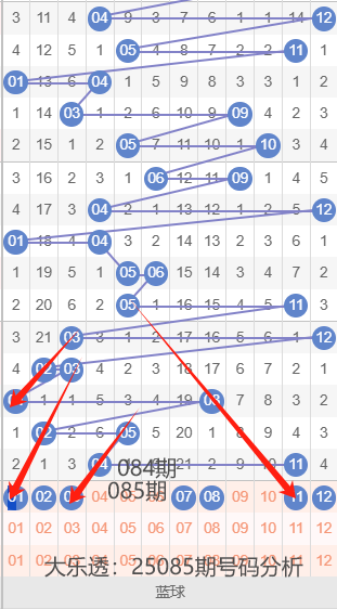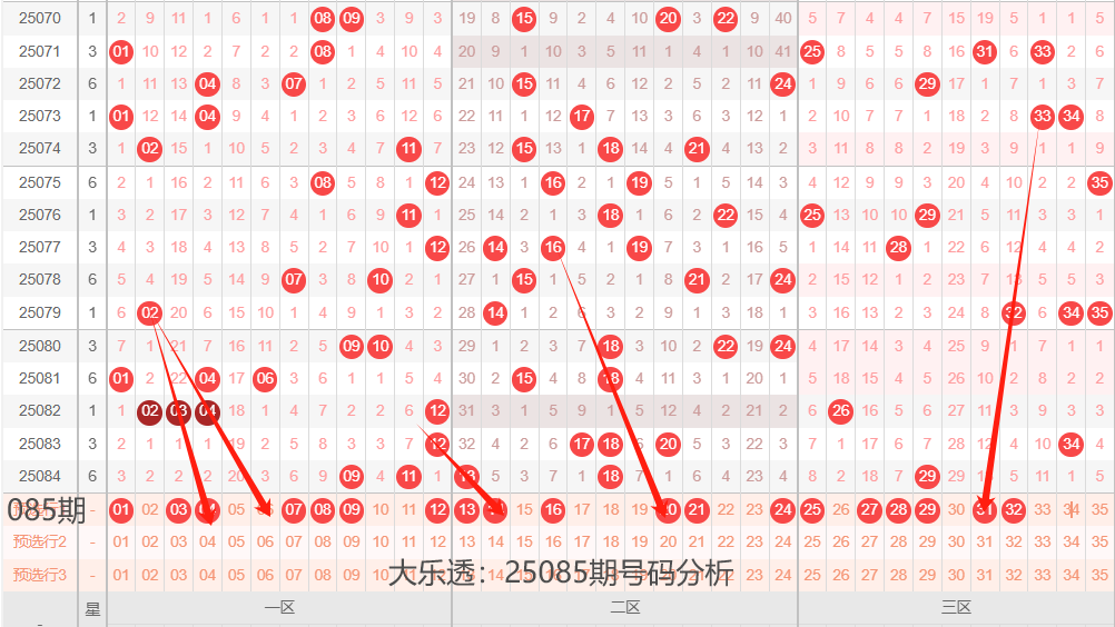 通过上期号码的简单分析,我们看下25085期红色号码球的总体走势,如下图: