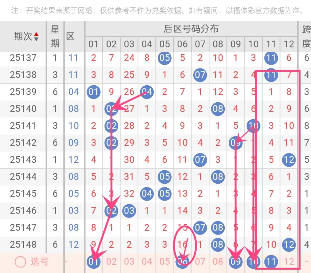 后区方面,近期以中小号为主,01、06、09、10、11均为中段温冷号,其中01已遗漏较长,06、09在近期后区中未见,具备开出潜力。后区组合建议以“一奇一偶、一中一大”为主,如01+10、06+11等组合,避免全奇或全偶极端形态。