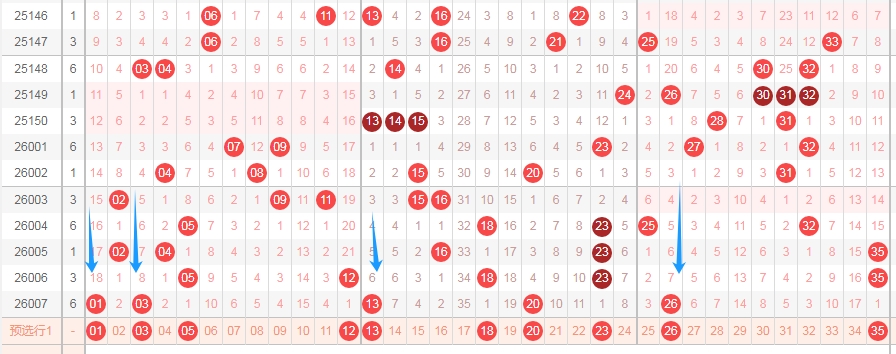 上图是体彩大乐透前区开奖号码走势图,我在上面走势图中标注出来的数字都是遗漏周期小的数字,因为上期开奖号码出现了几个遗漏周期大的数字,数字01遗漏周期18期,数字03遗漏周期8期,数字13遗漏周期6期,数字26遗漏周期7期,那么本期关注遗漏周期小的数字,上期的号码重复那就是遗漏周期等于0也是遗漏周期小的数字,隔一期的数字也是遗漏周期小的数字,看好这些数字01 03 05 12 13 18 20 23 26 35出2个或者3个吧。