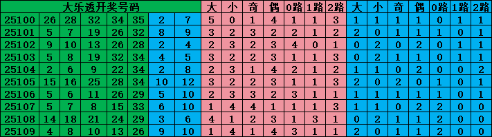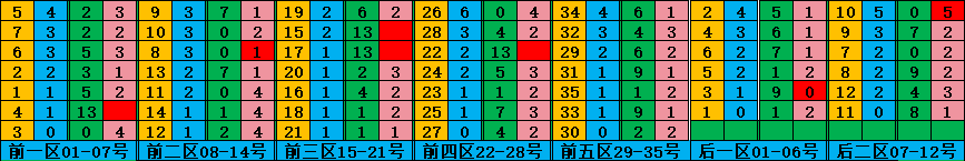 前区小01-17,大18-35,奇偶看尾数13579奇,02468偶,012路比看尾数0369是0路,147是1路,258是2路;后区小01-06,大07-12,奇偶看尾数13579奇,02468偶,012路比看尾数0369是0路,147是1路,258是2路。