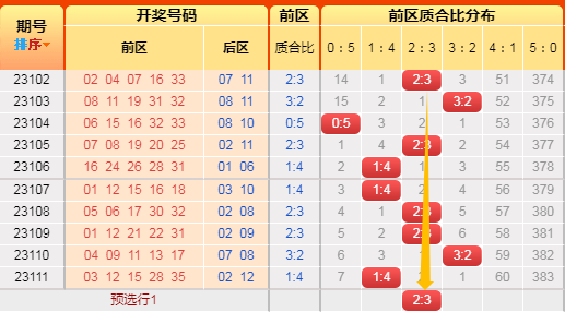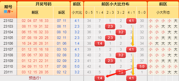 上期前区小大比5:0,这么冷的属性,难得一次,我放弃也罢。言归正传我们继续用历史数据说话,前区小大比分成6种0:5、1:4、2:3、3:2、4:1、5:0(如图),我统计了一下历史出现次数,0:5出现99次、1:4出现449次、2:3出现884次、3:2出现701次、4:1出现298次,5:0出现44次,再看近10期小大比出现次数比为0:1:3:3:2:1,通过数据观察,看1:4或4:1;(如想进一步了解,请直接上车或17点来直播间看直播)