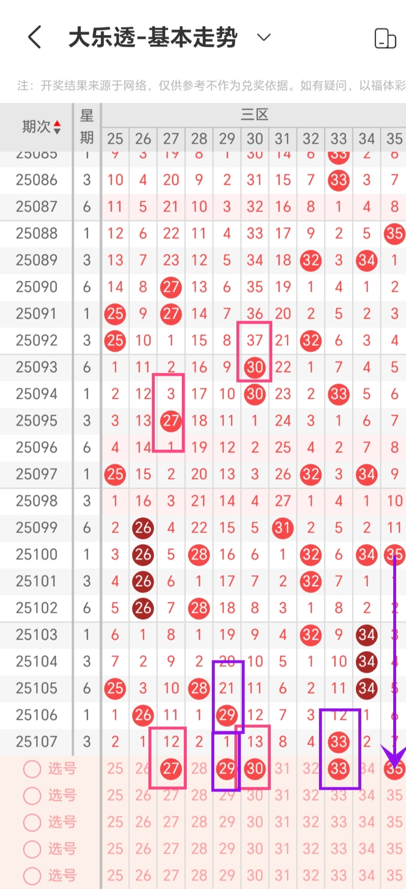 通过对周六邻码出现的数量规律进行统计分析,本期考虑出号1-3个,即14-15-16-17-24-26-27-29-33-35出号1-3个