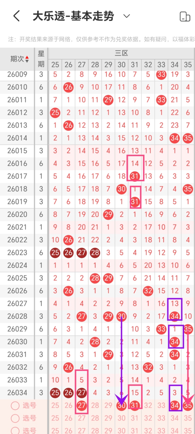 通过对同星期周六邻号出现数量规律进行统计分析,本期考虑出号1-3个,即02-03-04-05-18-20-25-27-31-33出号1-3个