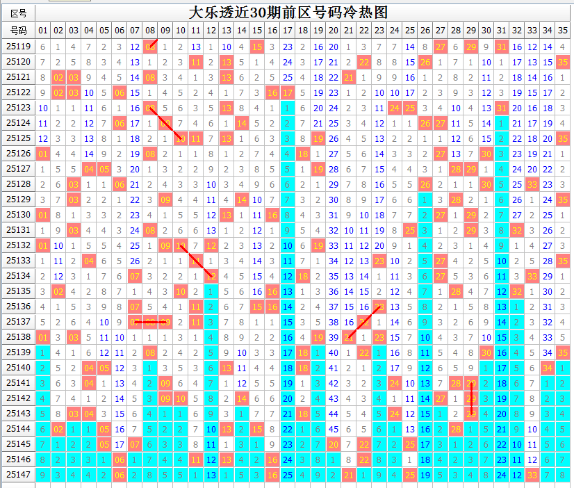 大乐透近30期前区号码冷热图(数字为遗漏期数,蓝色标记的为遗漏超过10期的大冷号)