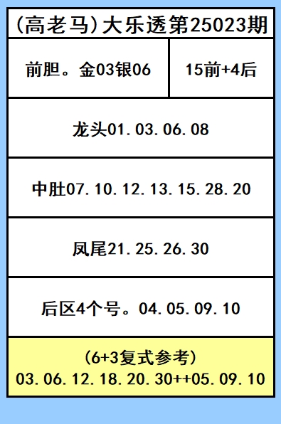 金:前区 01、06、11、16、21、26、31,后区 04、09