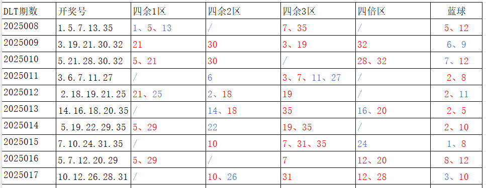 言归正传,分享第一个数据分析:四分区统计数据。相对于传统的三分区,个人习惯使用四分区,就是把35个红球号码除以4,所得的余数分区如下: