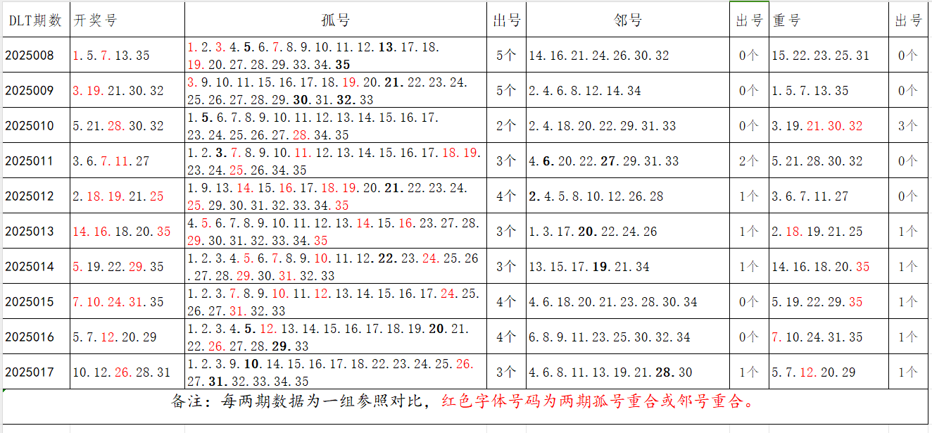 如图,以近两期数据为一组,进行对比分析,相同的孤号、邻号可能在下期开出。本期参考孤号:1.2.3.4.5.6.7.8.14.15.116.17.18.19.20.21.22.23.24.33.34.35;邻号:9.11.13.25.27.29.30.32。重点关注:孤邻号重合号码:***(会员专区可见)。个人分析,仅供参考。