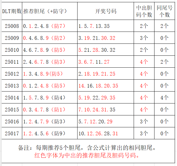 如图,每期推荐胆尾中出1-4个。上期推荐胆尾中出3尾3码!推荐胆尾是按照公式计算的顺序,不定位红球号码的顺序。本期推荐胆尾:6尾/3尾/1尾/8尾/0尾,加推防守胆尾+胆码号码:***(会员专区可见)。个人分析,仅供参考。