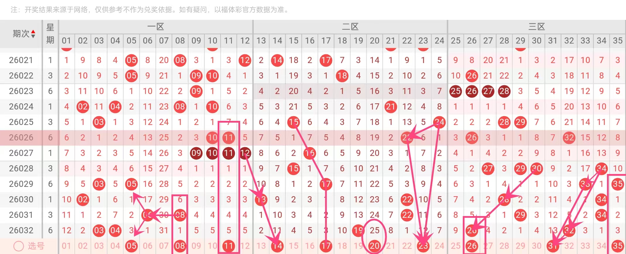 近5期未出现连号,但历史数据显示连号遗漏3—5期后易回补,本期适当防范连号可能,推荐中包含08、11、14、17、20、23、26、31、35等间距适中号码,其中08与11、14与17、20与23等存在潜在连号或间隔连号形态。重号方面,上期号码03、04、19、26、32中,26在近10期出现3次,属相对温号,本期保留26作为重号备选,同时纳入31、35等近期较冷号码平衡热度。
