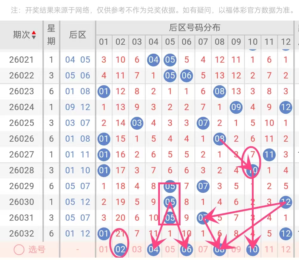 近5期后区组合分别为01+12、05+07、05+12、05+07、01+10,跨度多在5—11之间,且小号01、05频繁出现。本期后区杀去01、05、12后,剩余号码中02、04、06、08、10形成跨度2—8的合理分布,涵盖小大搭配(如02+08、04+10)与双小(02+04)、双大(06+10)多种可能,符合后区近期跨度多变的特点。