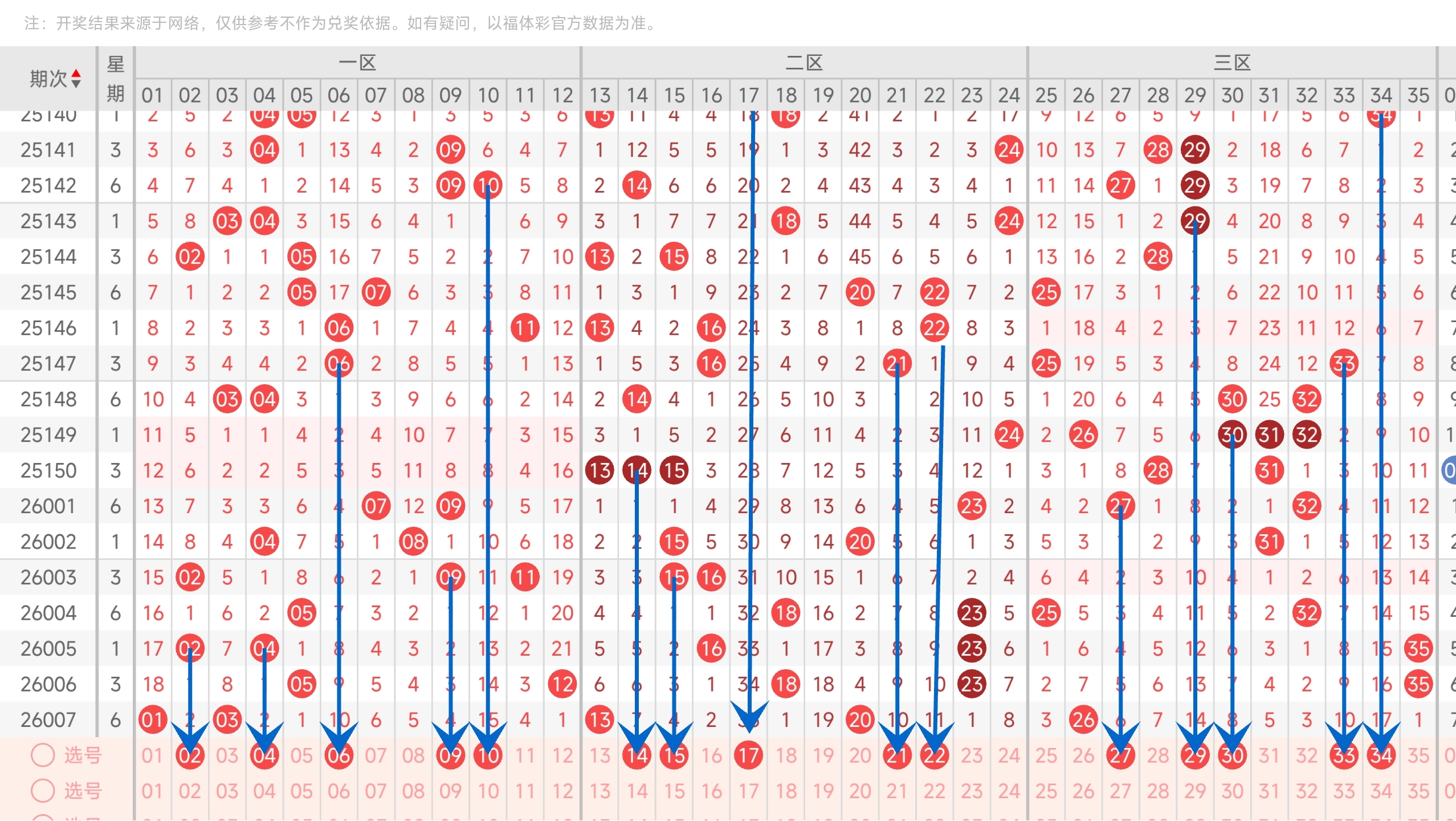 上期开出26号码,往前一期开出了35号。通过分析走势图,可以看到上期凤尾开了26,左边的号码回补,本期凤尾比较看好中间的号码,其次是右边的号码,最后防左边。最后再结合冷热号和遗漏期数,本期我们可以关注2729303334等号。综上所述本期三区我们推测可能会开2729303334等号码。