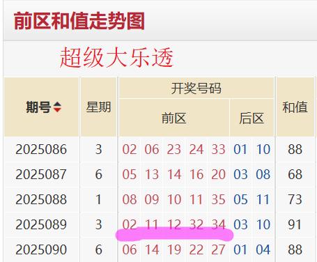 近五期大乐透开奖号码前区和值依次为88→68→73→91→88。前区和值均值为82。前区和值振幅为23,前区和值修正振幅为18。基于动态平衡干预以及波动趋势衡量,本期前区和值推测区间为64-100。基于风险对冲策略,本期前区和值区间缩水为64-98。基于前区和值分析,本期前区质数数量倾向于2-3枚。