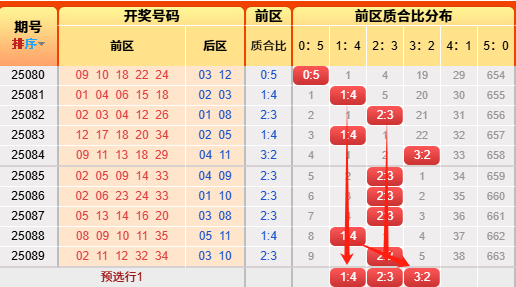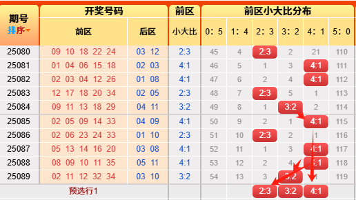 上期前区小大比3:2,连续多期命中范围。言归正传我们继续用历史数据说话,前区小大比分成6051423324150(如图),我统计了一下历史出现次数,05出现105次、14出现510次、23出现954次、32出现793次、41出现344次,50出现51次,再看近10期小大比出现次数比为003250,通过历史数据对比观察以及根据遗漏对称理论原则,故本期我们选择2:33:24:1具体精准方向请查看小车小大比精选)