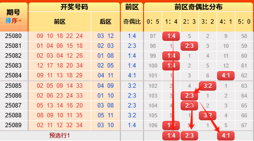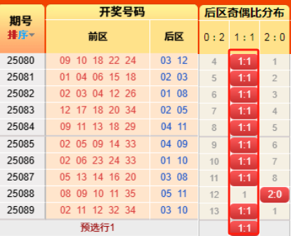 上期后区开出奇偶比为1:1,上期命中