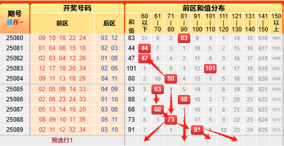 接下来我们来看前区小大、奇偶、质合、和值分布图: